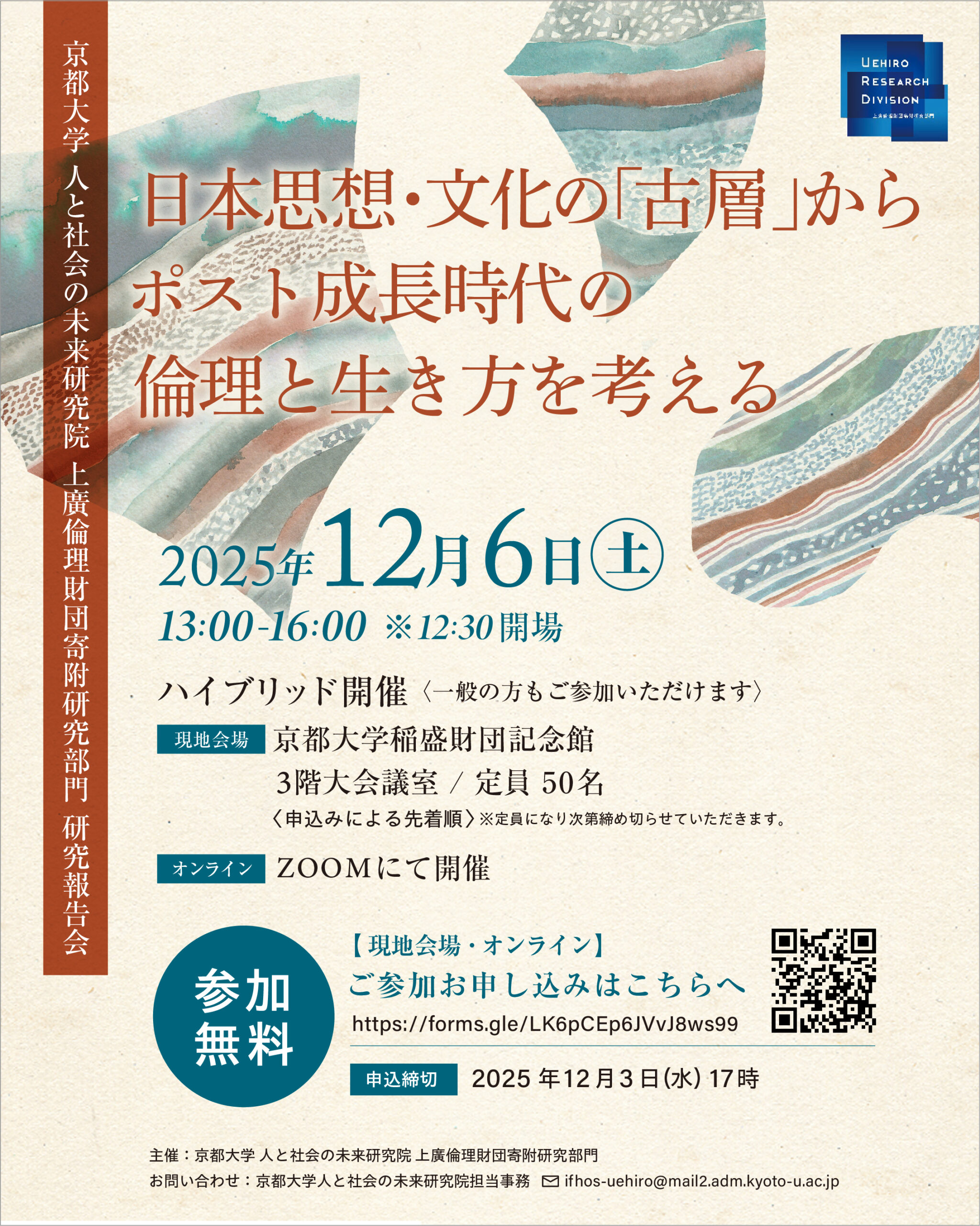Announcing the December UEHIRO Research Division Presentation “Ethics and Ways of Life in the Post-Growth Era through the Older Layers of Japanese Thought and Culture”